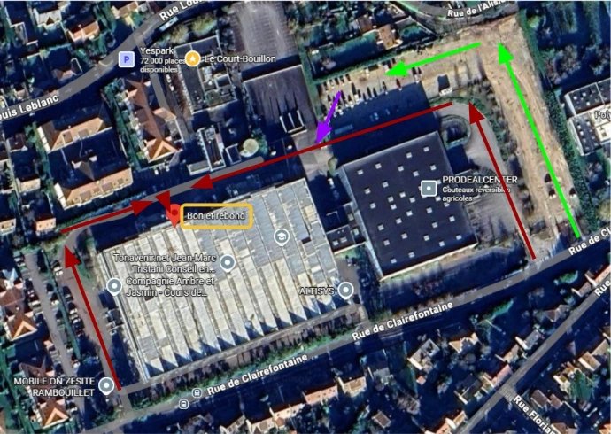 La flèche en mauve indique le chemin à prendre ensuite à pied pour accéder à l’atelier